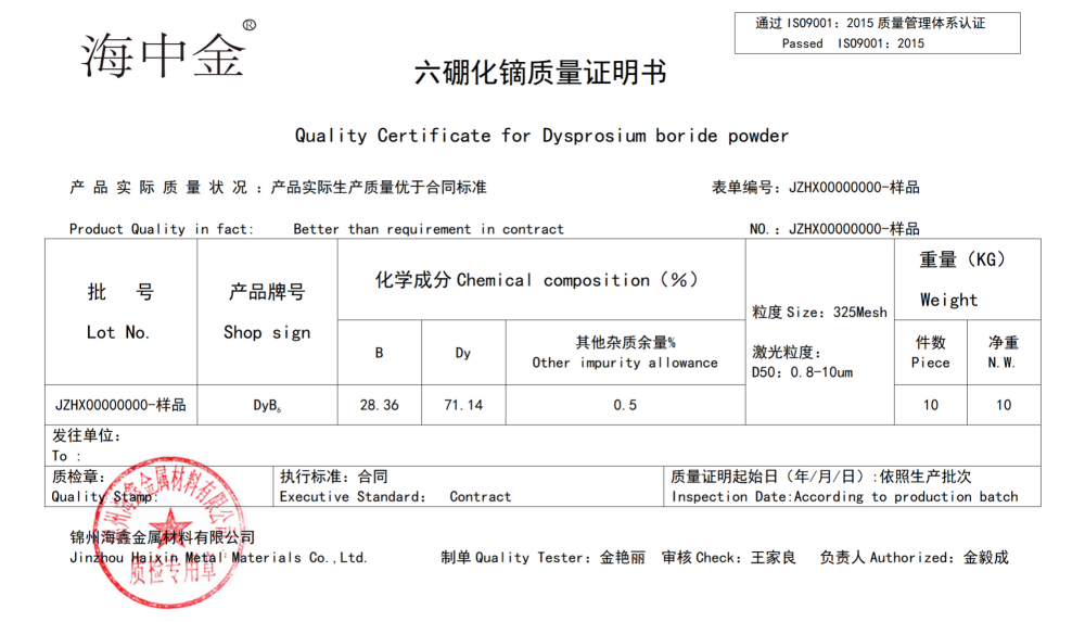 產(chǎn)品名稱(chēng):六硼化鏑(DyB6)