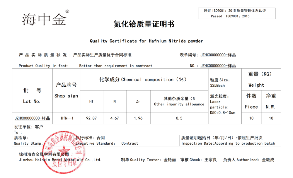 2. 高熔點:氮化鉿的熔點非常高,約為3310℃。